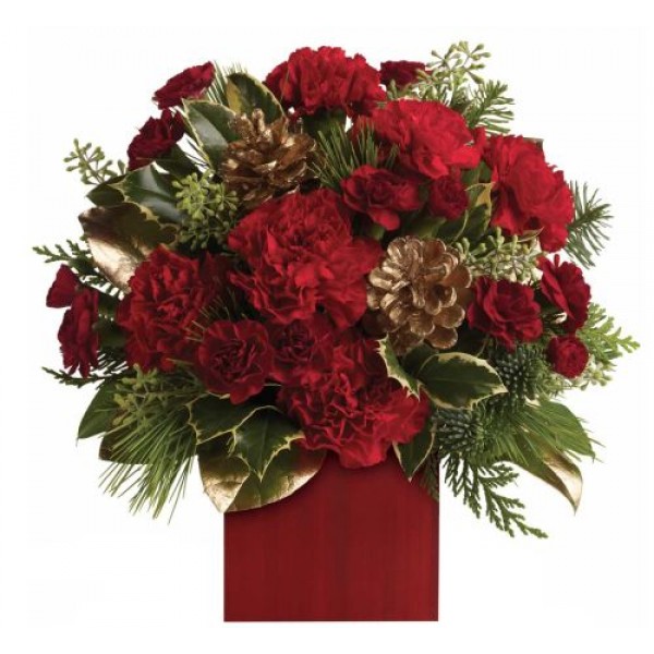 Warm up cold winter days with good cheer! Featuring red carnations and maroon miniature carnations accented with tips of noble fir, flat cedar, holly, white pine and assorted greens.